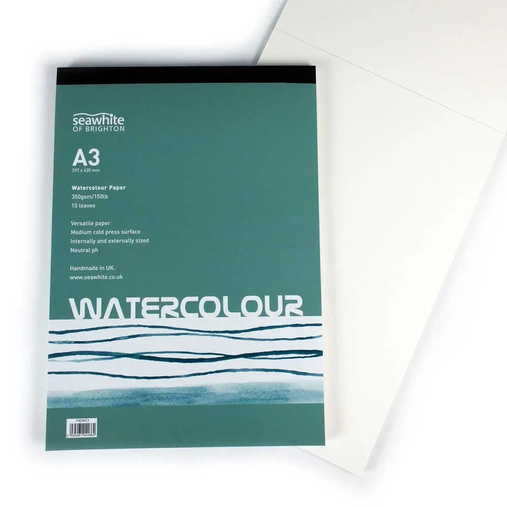 Watercolour pad. Attractive printed cover with 2mm rigid board backing. Glued and tape-bound on the short edge.