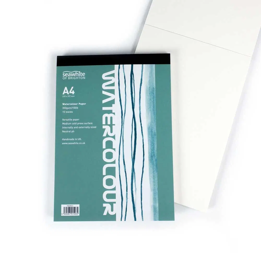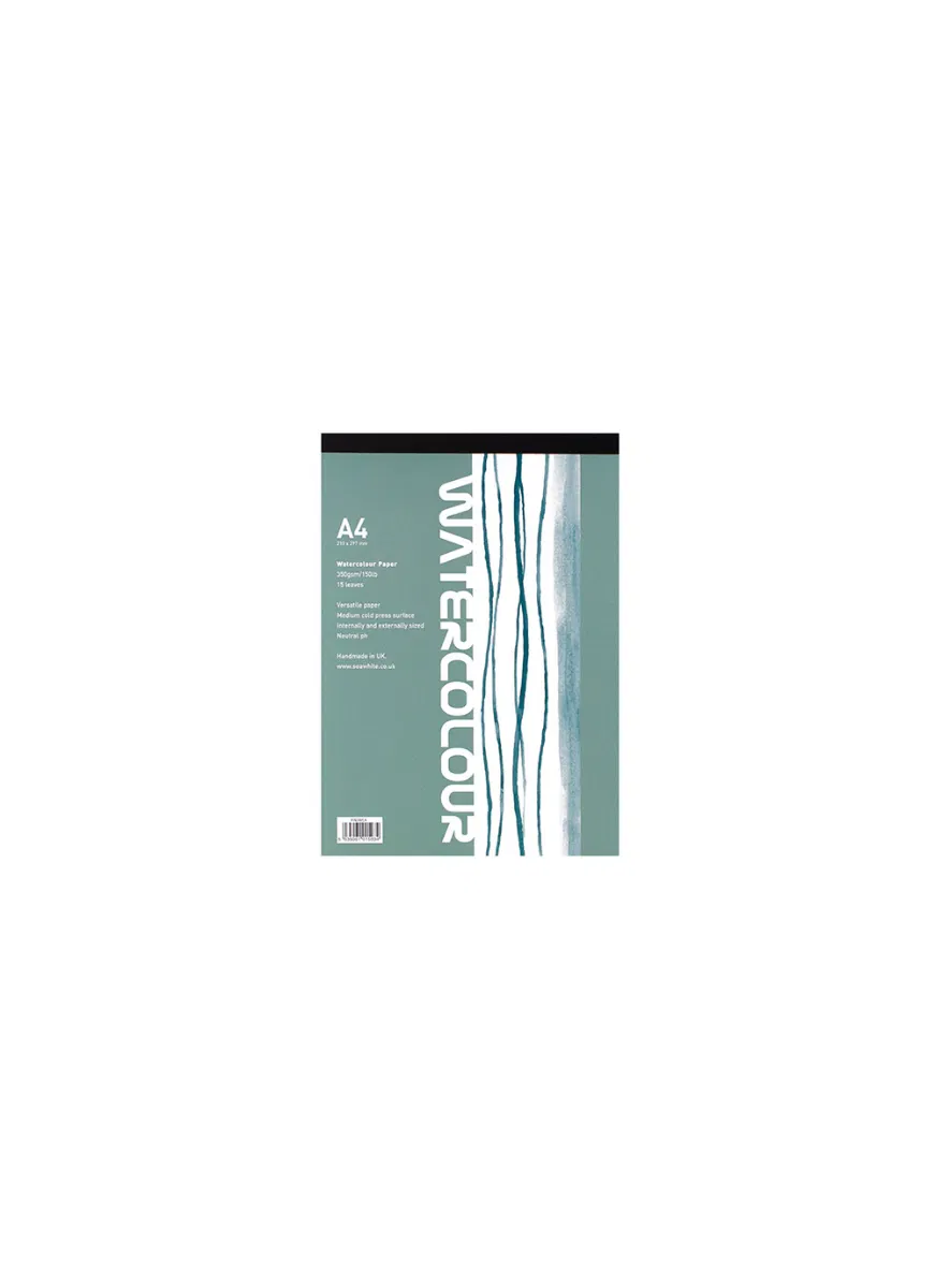 Watercolour pad. Attractive printed cover with 2mm rigid board backing. Glued and tape-bound on the short edge.