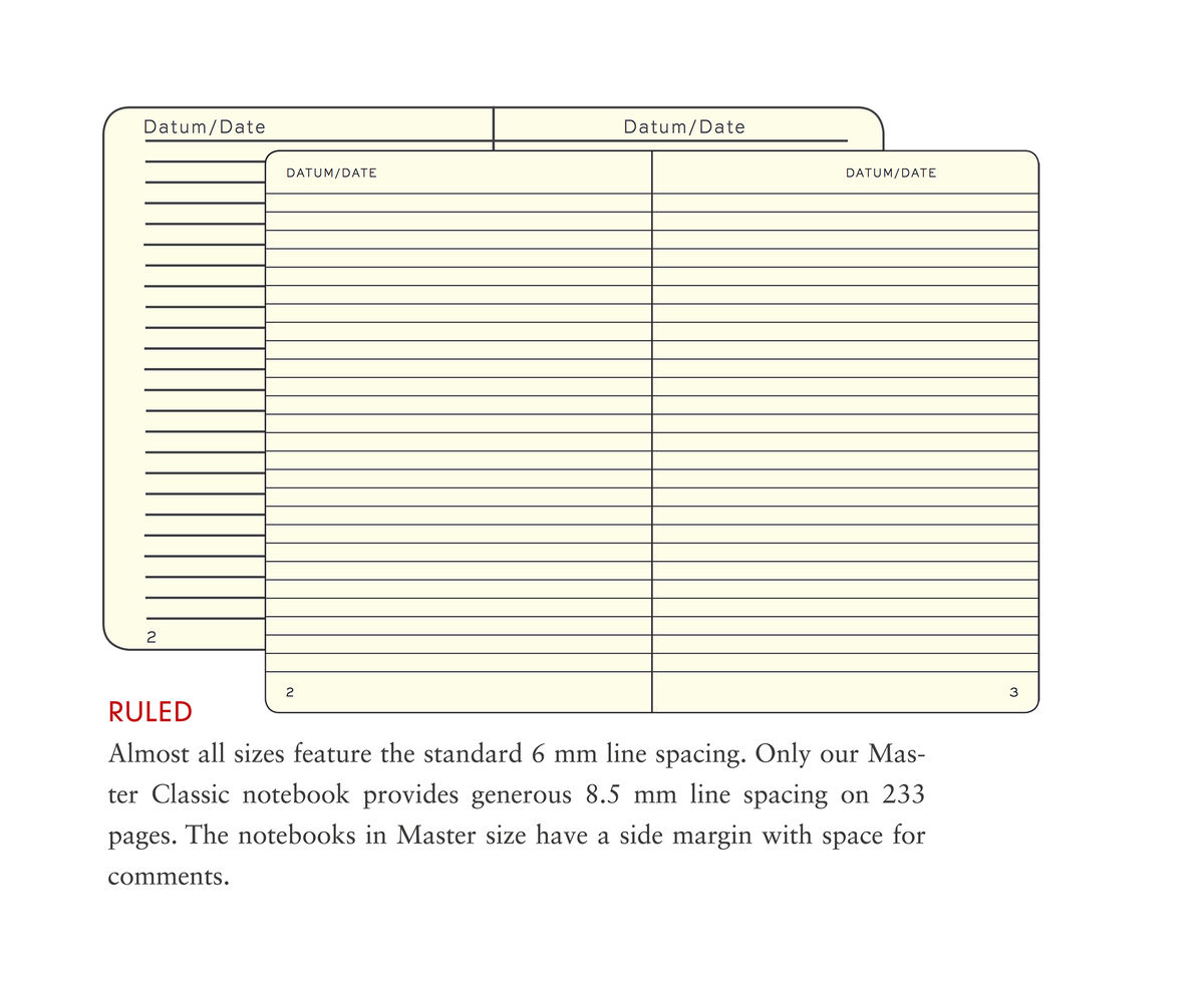 The slim alternative: our Master Slim. The Master Slim is also larger than A4 and can hold loose sheets between the pages and in the expandable pocket without the edges protruding. Furthermore, the Master Slim notebook features 100 g/m² paper. However, it only has 121 pages and is therefore 33% lighter than the Master Classic notebook. This means that the Master Slim is the ideal companion for all notebook-lovers who want to write in ink and always have their notebook to hand.