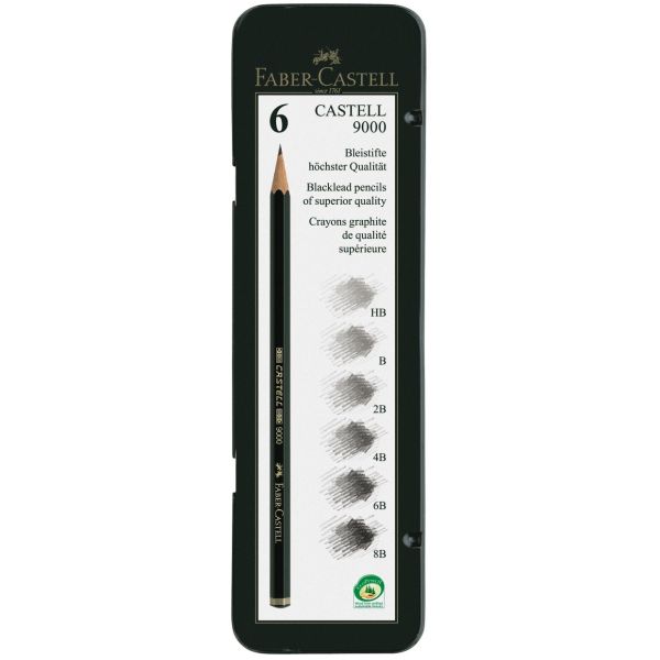 The Art Set contains 12 CASTELL 9000 pencils in hardness grades 8B – 2H; Ideally suited for artistic and high contrast work; Environmentally safe water-based coating; Extra break-resistant due to SV bonding; Available as individual pencils or in various assorted sets