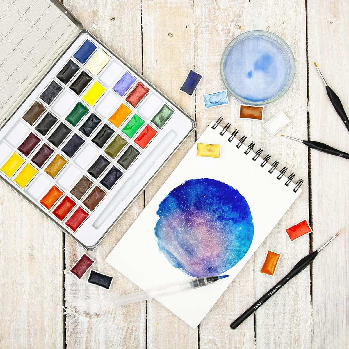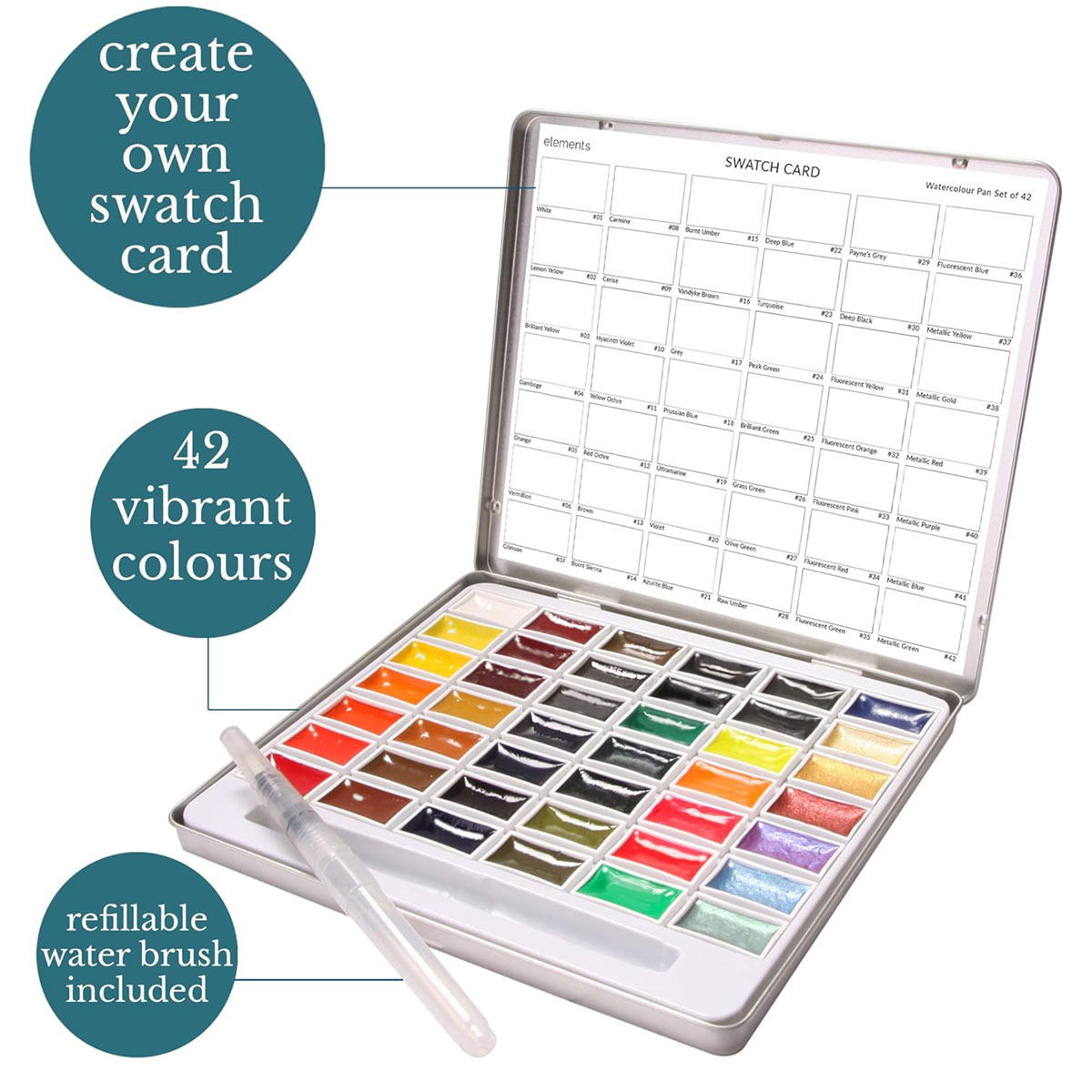 Includes 30 traditional colours, 6 vibrant neon colours, 6 shimmering metallics and 1 versatile waterbrush