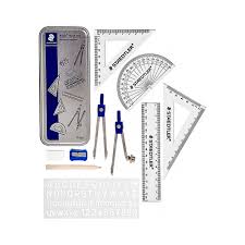 Staedtler Noris Maths Set Tin. Metal tin containing 15 cm ruler, 180° protractor, 45° & 60° set squares, sharpener, eraser, pencil, compass, dividers and lettering guide.