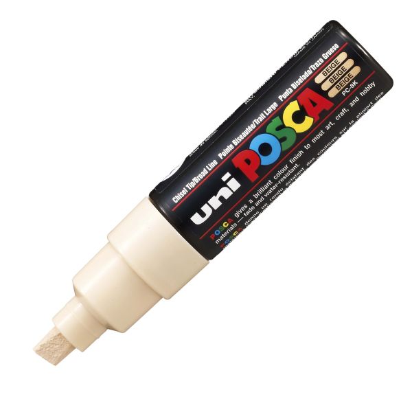 These markers have a large chisel shaped fibre tip making them ideal for filling in background colours or working on large scale art like wall murals or urban art. Posca writes on virtually any surface; metal, wood, canvas, plastic, fabric, etc, and will not ‘bleed through’ paper. POSCA markers use water-based pigment ink to produce poster-paint-like vibrant colours. Posca is easily removed from glass, making it ideal for temporary signs and window art. Once dry, you can easily layer over the top to build your design and correct any errors. Alcohol free, solvent free